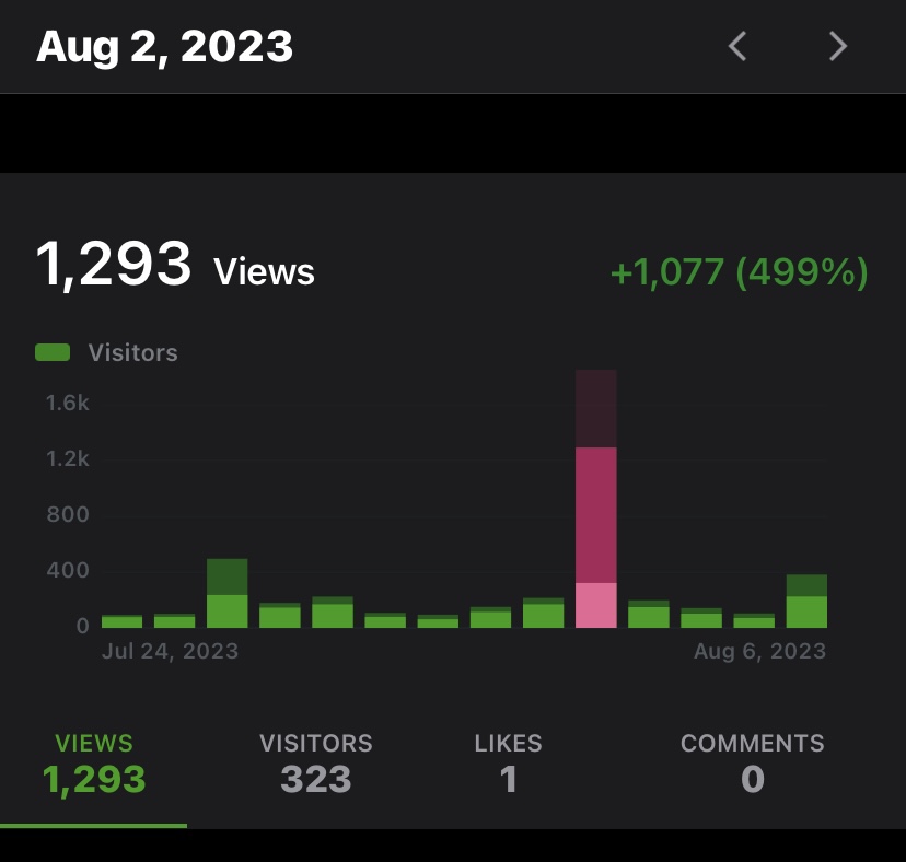 August 2, 2023 best day for Pageviews with 1,293 that day. Not sure why the spike but it was a spike.