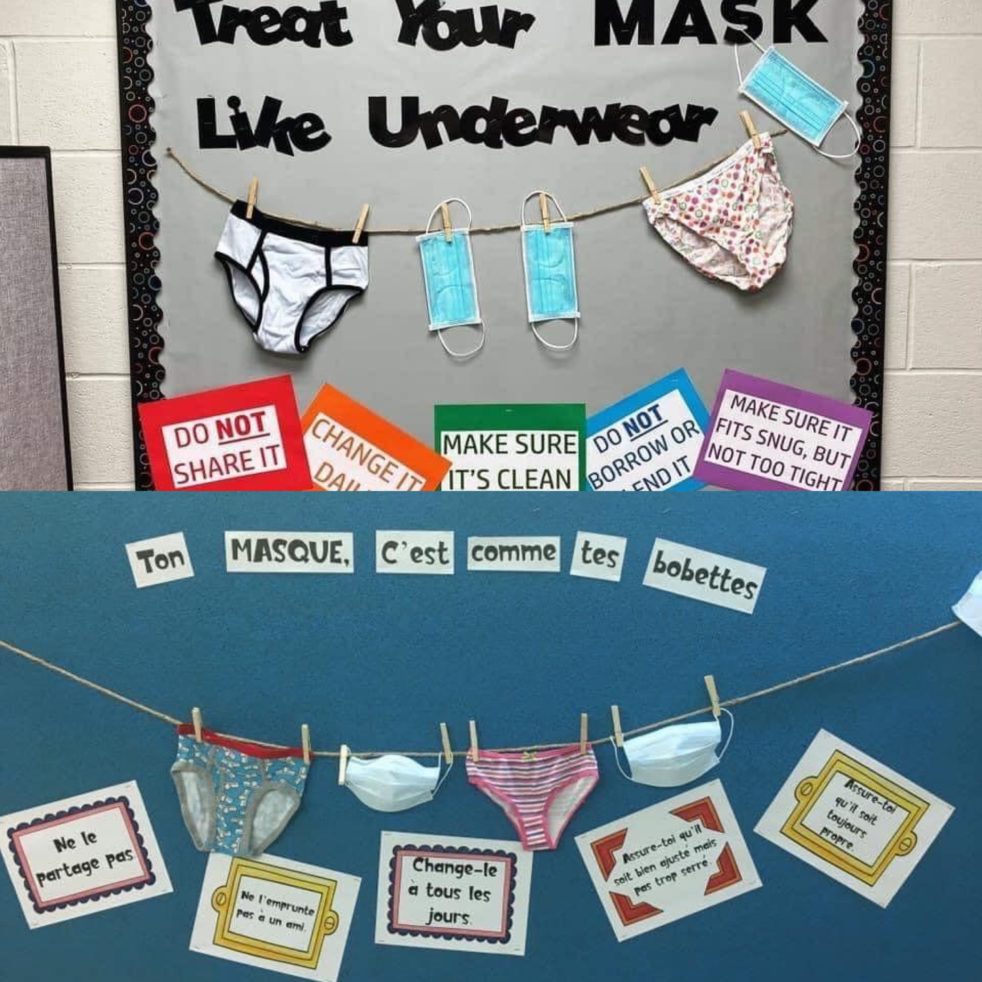 Treat your mask like underwear – creative bulletin boards are popping up in schools like these about face masks.
